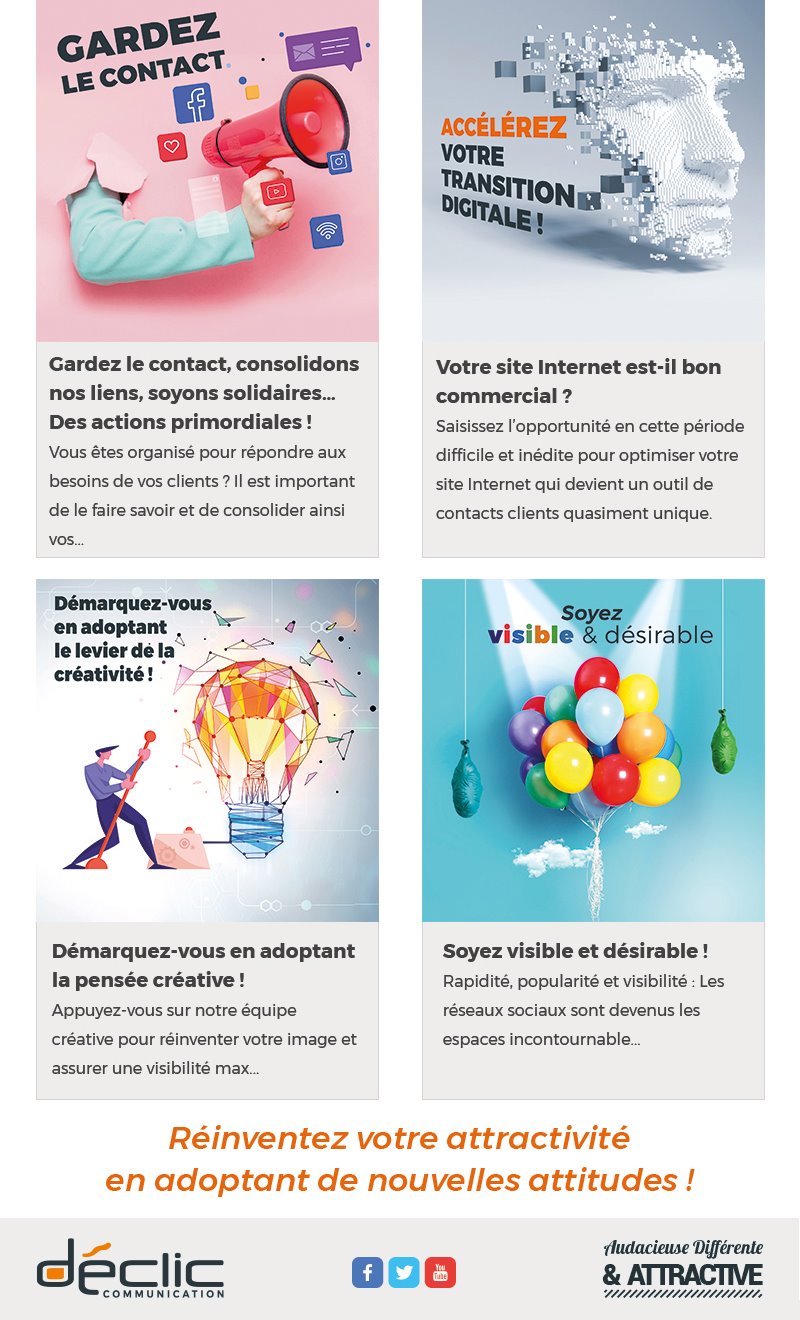L’e-mailing est un outil pragmatique de contact avec vos clients et prospects qui souhaitent en savoir plus au sujet de votre activité, de vos services ou produits. Les accroches visuelles et textuelles sont très importantes pour passer votre message efficacement.